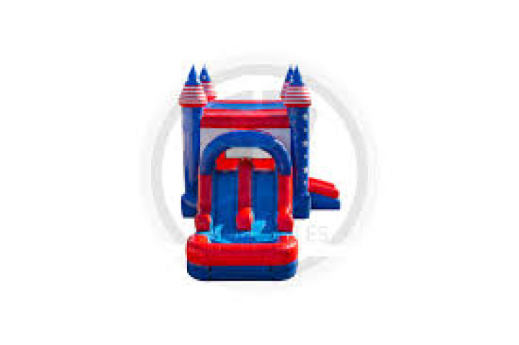 Features a large bounce area, basketball hoop, and double lane slide with a pool which can be used wet or dry.